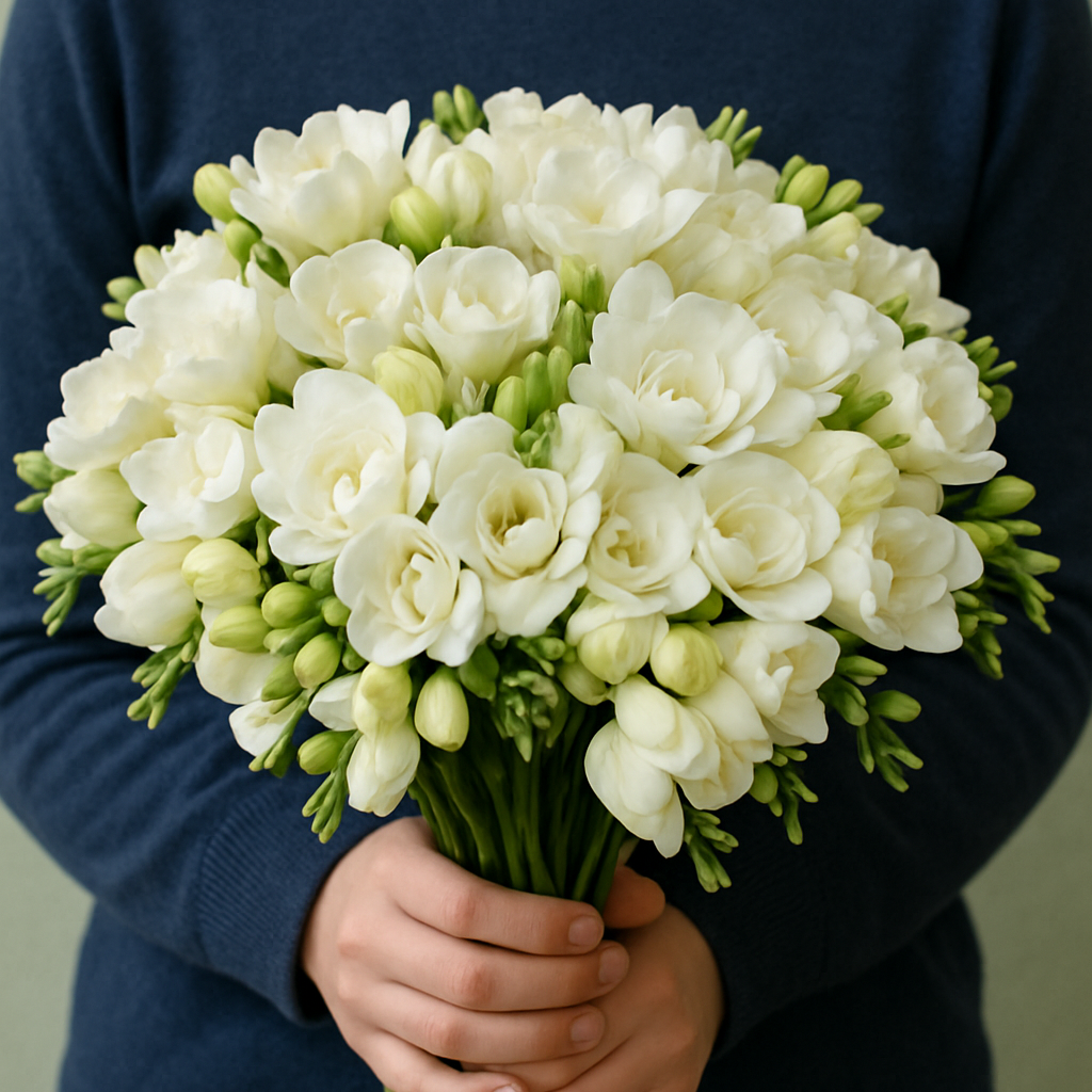 Baltās frēzijas simbolizē tīrību un maigumu. Tām ir maigs, patīkams aromāts, kas piešķir pušķiem eleganci. Lieliski izskatās gan solo, gan maigās kompozīcijās.