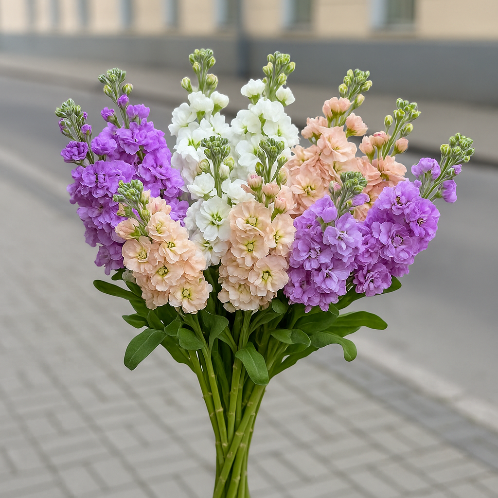 Dažādu krāsu matiolas vienā pušķī izskatās koši un dzīvīgi. Aromātiskas un bagātīgas, tās piešķir svētku sajūtu jebkurā telpā. Ideālas dāvanām un pavasara svētkiem.