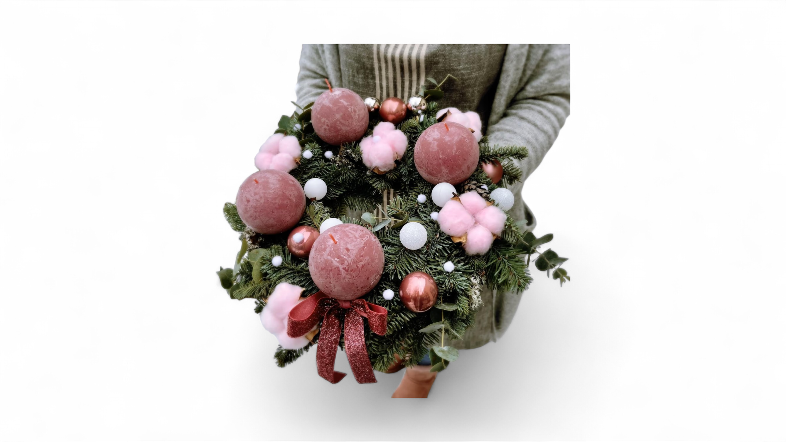 Adventes vainadziņš ar svecēm un dekoru rozā toņos. Attēlam ir informatīvs raksturs.